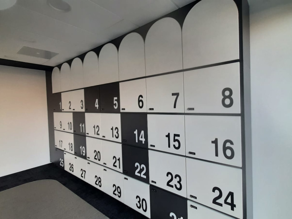 Duże, czytelne numery na frontach skrytek ułatwiają identyfikację użytkownikom, a kontrastowe wykończenie nadaje szafkom nowoczesnego charakteru. Dzięki starannie dobranym materiałom i kolorom szafki skrytkowe z zamkiem na zamówienie doskonale wpasowują się w przestrzeń siłowni, tworząc spójną i przyjazną atmosferę.