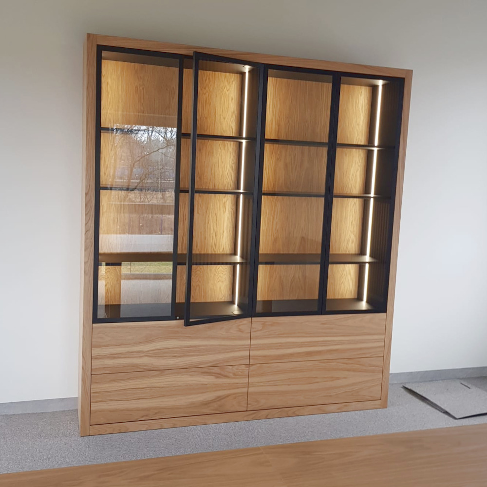 Witryna została zaprojektowana z myślą o maksymalnej funkcjonalności, by sprostać potrzebom przestrzeni biurowych. Wnętrze szafki na wymiar zostało starannie podzielone na praktyczne półki, które pozwalają na przechowywanie zarówno dokumentów, jak i przedmiotów dekoracyjnych, takich jak nagrody czy certyfikaty. Dzięki przemyślanemu układowi, witryna ta nie tylko spełnia swoje funkcje użytkowe, ale również stanowi elegancki element wystroju, który nadaje biuru profesjonalny charakter.